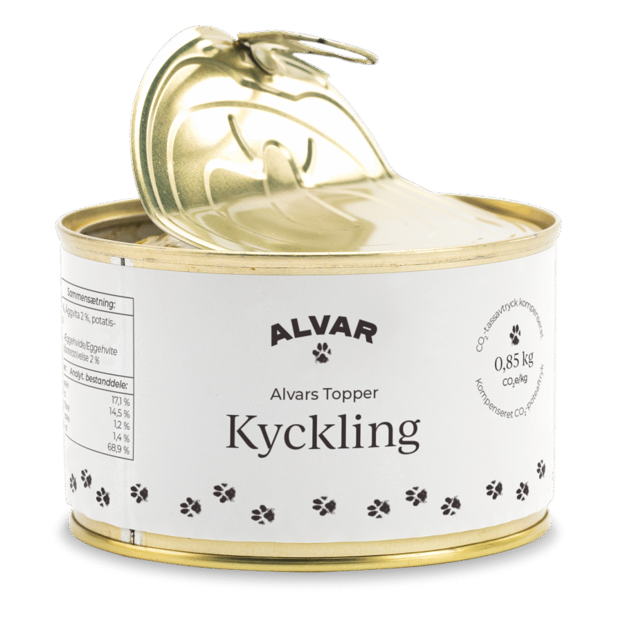 Alvars Kycklingtopper är inte bara god, den är också tillverkad av hållbara ingredienser som hjälper till att hålla din hunds koldioxidavtryck lågt. Blötmaten passar hundar i alla storlekar och former, inklusive valpar, och är tillverkad i Finland med lokala, naturliga ingredienser.
